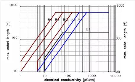 以某品*污泥流量計(jì)選型樣本提供的電導(dǎo)率和電纜長(zhǎng)度曲線為例,其中A型電纜為雙芯雙屏蔽DS300、B型電纜為雙芯三屏蔽BTS300。像浙江省一般水庫(kù)原水電導(dǎo)率在100us/cm左右,安裝所需電纜線小于100米,選A型即可,超過(guò)100米,需要選B型。