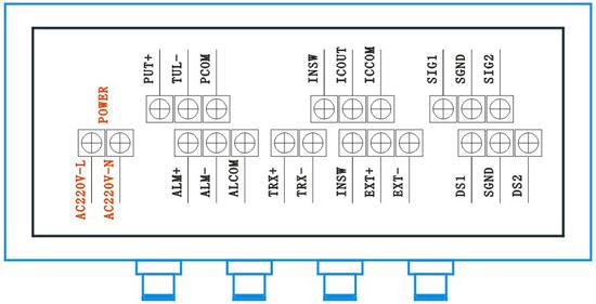 ③報(bào)警輸出:上限報(bào)警輸出接“ALM+”端子,報(bào)警地接“ALCOM”端子;下限報(bào)警輸出接“ALM-”端子,報(bào)警地接“ALCOM”端子。