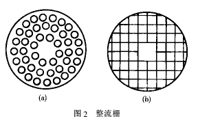 圖2為圓孔和方孔兩種形狀整流柵,整流柵直徑為100mm,寬為15mm。方孔流通面積約為圓孔流通面積的4/3。中間實體為固定整流柵螺釘位置。