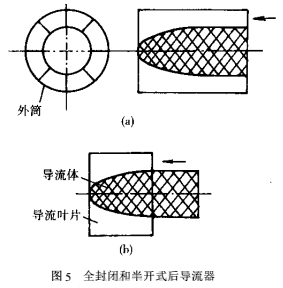 圖5(a)、(b)分別為全封閉和半開式兩種結(jié)構(gòu)的后導(dǎo)流器示意圖。導(dǎo)流葉片數(shù)均為8,內(nèi)導(dǎo)流體幾何形狀為橢球形。兩者不同之處在于全封閉式導(dǎo)流葉片由導(dǎo)流器進(jìn)口延伸至出口,而半開式導(dǎo)流葉片則由導(dǎo)流器中間起到出口處。