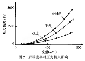 圖7為分別采用三種后導(dǎo)流器而其余部件不變條件下流量計的壓力損失曲線。由圖可知,在流量為0~100m³/h范圍內(nèi),三種結(jié)構(gòu)的壓力損失均很小,可以認(rèn)為壓力損失在小流量工況下對幾何結(jié)構(gòu)不敏感,即后導(dǎo)流器的幾何形狀變化還沒有對壓損產(chǎn)生影響。隨著流量的增大,三條曲線明顯拉開了距離,其中全封閉式壓損增長*快,半開式次之,壓損*小的是改進(jìn)式,在額定*大流量600m³/h處,改進(jìn)式壓損僅為700Pa,約為半開式壓損的1/2,為全封閉式壓損的1/3。當(dāng)流量進(jìn)一步增大,這種差距還將隨之增加。由此可見,選擇合適的導(dǎo)流器可以大大降低流量計的壓力損失。在流量計的工程應(yīng)用中,有必要對前、后導(dǎo)流器幾何參數(shù)進(jìn)行優(yōu)化,以達(dá)到*小壓損目的。