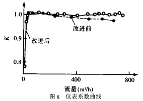 由圖8可看出,采用改進(jìn)的后導(dǎo)流器后,流量計儀表系數(shù)比改進(jìn)前有較好的改善,在量程范圍內(nèi)(60~600m³/h),K很好地體現(xiàn)了系數(shù)的特性,甚至在超過*大量程后,能繼續(xù)保持水平直線狀態(tài)。改進(jìn)前的流量計K值也較好,但隨著流量增大,直線略向下傾斜,偏離了水平位置。
