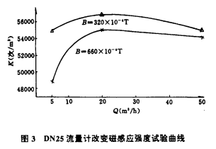 位于流量計之上,緊貼殼體處安裝著磁電轉(zhuǎn)換器,它將對渦輪葉片(由鐵磁性材料制成)產(chǎn)生一個恒定的磁性阻力矩。無論葉片處在靜止或轉(zhuǎn)動過程中都將始終受到這一磁力作用。這一磁力將直接影響著流量計的性能,尤其小流量時影響更大。為了研究該磁力對流量計性能的影響情況,我們選取適當(dāng)?shù)拇鸥袘?yīng)強(qiáng)度,對同一臺DN25流量計進(jìn)行了變磁感應(yīng)強(qiáng)度B的影響試驗,其試驗結(jié)果見表3和圖3。