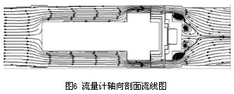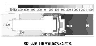 以流量Q=250m3/h的數(shù)值模擬計算結(jié)果為例進(jìn)行渦輪流量計內(nèi)部流場及壓力場的分析,圖5為渦輪流量計軸向剖面靜壓分布圖,前導(dǎo)流器前后的壓力場分布較均勻且壓力梯度較小,在機芯殼體與葉輪支座連接凸臺處壓力有所增加,連接面后壓力又逐漸減小,故認(rèn)為流體流經(jīng)葉輪支座產(chǎn)生壓力損失的主要原因是連接處存在凸臺,導(dǎo)致流場出現(xiàn)較大變化,不能平滑過渡,建議將葉輪支座與機芯殼體的連接改為圓弧線型或流線型。觀察圖5和圖6,當(dāng)流體流經(jīng)葉輪從后導(dǎo)流器流出渦輪流量計時,壓力梯度變化明顯,存在負(fù)壓區(qū)域并造成很大的壓降,在后導(dǎo)流器凸臺及流量計出口處速度變化明顯,由于氣流通過后導(dǎo)流器后流道突擴,在后導(dǎo)流器背面形成明顯的低速渦區(qū),產(chǎn)生了漩渦二次流。
