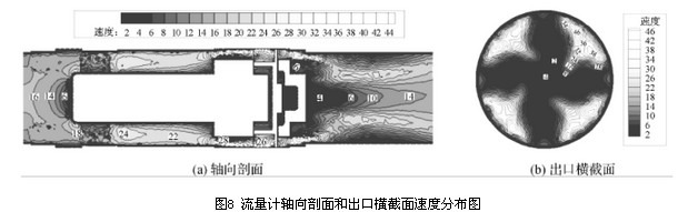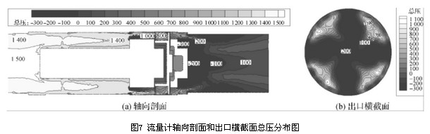 結(jié)合圖7、圖8流量計軸向剖面和出口橫截面的總壓及速度分布圖,其速度分布與壓力分布相似,流量計流道內(nèi)速度分布較均勻的區(qū)域其壓力梯度變化也較小,即流道內(nèi)速度的分布和變化與壓力損失大小相關(guān)。由流量計軸向剖面和出口橫截面的速度及壓力分布圖可以看出,流量計后導(dǎo)流器處產(chǎn)生的漩渦二次流影響了出口橫截面處的速度及壓力分布
