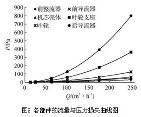 2)分析各部件對壓力損失的影響,其壓力損失與流量成二次函數(shù)關(guān)系。后導(dǎo)流器相對于其他部件是壓力損失的主要因素,約占總壓力損失的一半,隨著流量的增加其壓力損失占總壓力損失的比例上升了12.06%。葉輪支座的壓力損失約占總壓力損失的1/4,其壓力損失比例隨流量的增加基本不變。隨著流量的增加葉輪產(chǎn)生的壓力損失比例降幅明顯。通過數(shù)值模擬分析得出速度的分布和變化與壓力損失大小相關(guān),通過優(yōu)化流量計流道內(nèi)的速度分布可降低流量計的壓力損失,后續(xù)相關(guān)的渦輪流量計優(yōu)化研究可從優(yōu)化其流道內(nèi)速度分布入手。