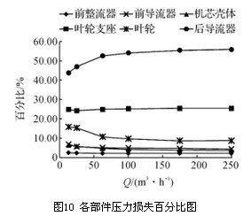 觀察圖10各部件壓力損失百分比圖,可見前整流器、前導(dǎo)流器和機芯殼體處的壓力損失很小,葉輪支座處壓力損失約占總壓力損失的1/4。前整流器所占壓力損失比例在各流量點基本保持不變,前導(dǎo)流器和機芯殼體處的壓力損失隨流量的增加其比例略有降低,葉輪支座處壓力損失隨流量的增加其比例略有增加,但總體上受流量影響不大。葉輪處的壓力損失隨流量從13m3/h增加至250m3/h,其比例從15.88%降至8.71%,降幅明顯,后導(dǎo)流器處的壓力損失占總壓力損失的大半,隨著流量從13m3/h增加至250m3/h其壓力損失比例由43.77%升至55.83%,增幅明顯??傊髮?dǎo)流器、葉輪支座和葉輪是流體流經(jīng)渦輪流量計產(chǎn)生壓力損失的主要影響部件,可通過優(yōu)化其結(jié)構(gòu)以降低渦輪流量計的總壓力損失。