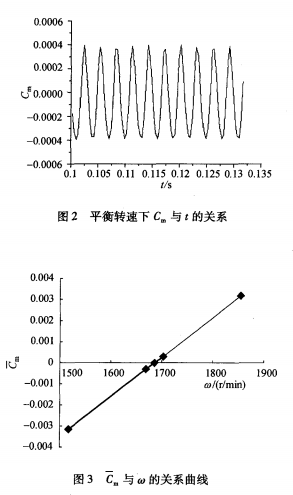 圖2即為葉輪在平衡轉速下旋轉時Cm的周期性變化過程。假定Cm為Cm值在一定計算時間內的平均值,計算時問通常約為一個葉輪軸的旋轉周期。通過計算發(fā)現(xiàn),Cm基本上與葉輪轉速呈線性比例關系,見圖3。Cm等于零所對應的ω則表示葉輪在此轉速下旋轉達到了力矩平衡。因此在實際計算中,可以選取兩個轉速進行計算,建立Cm與ω的線性關系,然后利用此關系確定葉輪的平衡轉速。當然,預先能對葉輪處于平衡狀態(tài)下的轉速進行估計,縮小設定轉速與平衡轉速的范圍,利用這種方法確定葉輪平衡轉速的精確度將更加高。