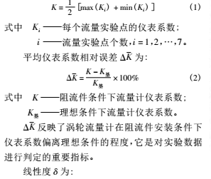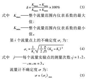 渦輪流量計(jì)的原理:當(dāng)被測(cè)流體流過(guò)傳感器時(shí),在流體作用下,葉輪受力旋轉(zhuǎn),其轉(zhuǎn)速與管道平均流速成正比,葉輪的轉(zhuǎn)動(dòng)周期改變磁電轉(zhuǎn)換器的磁阻值,檢測(cè)線圈中的磁通隨之發(fā)生周期性變化,產(chǎn)生周期性的感應(yīng)電勢(shì),即電脈沖信號(hào)。基于渦輪流量計(jì)的測(cè)量原理,根據(jù)渦輪流量計(jì)檢定規(guī)程,確定了實(shí)流實(shí)驗(yàn)結(jié)果的評(píng)價(jià)指標(biāo),其中包括: 儀表系數(shù)、平均儀表系數(shù)相對(duì)誤差、線性度和不確定度。