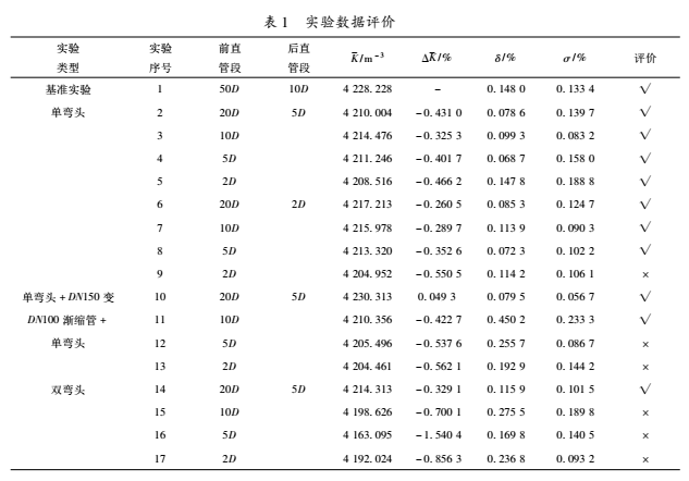 c.在后2D的數(shù)據(jù)中,前2D的結(jié)果不滿足評(píng)價(jià)準(zhǔn)則,所以對(duì)單彎頭而言,后直管段長(zhǎng)度為5D情況下前直管段長(zhǎng)度至少為2D,后直管段長(zhǎng)度為2D情況下前直管段長(zhǎng)度至少為5D。